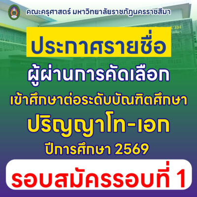 ตามที่ คณะครุศาสตร์ มหาวิทยาลัยราชภัฏนครราชสีมา ได้รับสมัครคัดเลือกบุคคลเพื่อเข้าศึกษาต่อระดับบัณฑิตศึกษา ประจำภาคการศึกษาที่ 1 ปีการศึกษา 2569 นั้น บัดนี้ คณะครุศาสตร์ มหาวิทยาลัยราชภัฏนครราชสีมา ได้ดำเนินการคัดเลือกและประกาศรายชื่อผู้มีสิทธิ์เข้าศึกษาต่อระดับบัณฑิตศึกษา ตามเอกสารบัญชีรายชื่อผู้มีสิทธิ์เข้าศึกษา 1 พร้อมทั้งให้ผู้มีรายชื่อดังกล่าวดำเนินการดังต่อไปนี้
